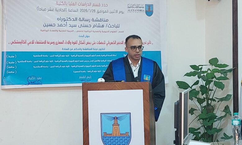 حصل الباحث هشام حسني سيد أحمد حسين، المدرس المساعد بقسم العلوم الحيوية والصحية الرياضية بكلية علوم الرياضة للبنين جامعة الإسكندرية، على درجة الدكتوراه في علوم الرياضة، عن الرسالة العلمية المقدمة منه بعنوان: “تأثير تدريبات نوعية باستخدام التحفيز الكهربائي للعضلات على بعض أشكال القوة والأداء المهاري وسرعة الاستشفاء للاعبي الكاليستنكس”،